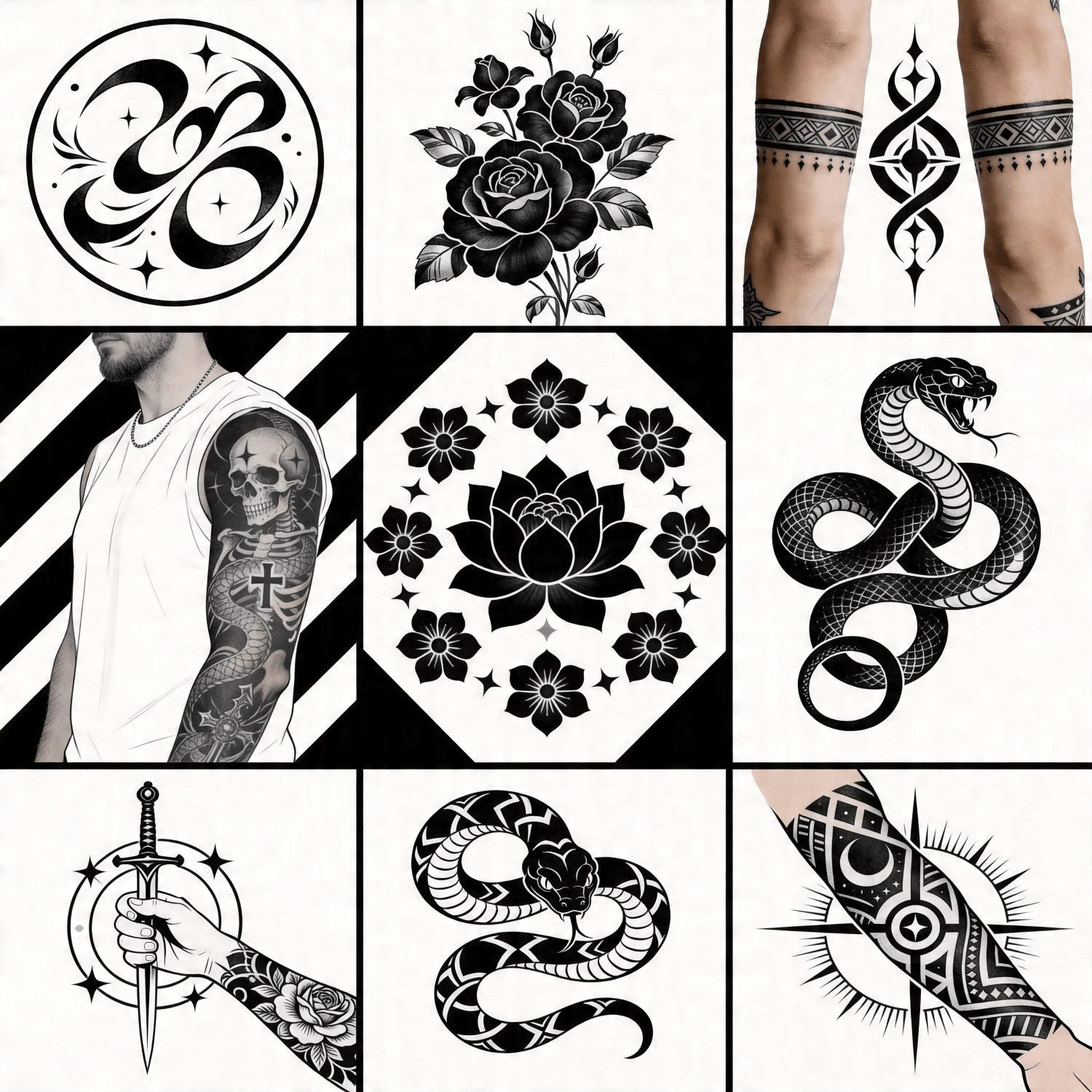 Embrace the power of pure black ink with this Blackwork tattoo pack. Featuring over 20 bold and modern designs, including abstract shapes, blackwork floral, tribal patterns, blackout sleeve compositions, solid fill snakes, and heavy contrast geometric elements. Each design is crafted with dense black ink, striking contrast, and minimalist aesthetics. Perfect for those seeking high-impact, sophisticated, and dark body art that works for all genders. These designs range from small accents to full sleeve layouts. All files are high-resolution (300 DPI) with transparent background, ready for tattoo artists. Instant digital download.