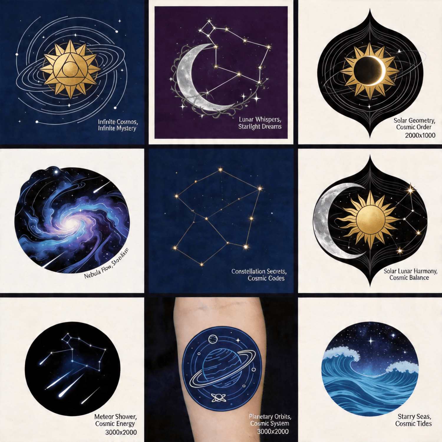 Connect with the cosmos through this Celestial tattoo pack. Featuring over 10 mystical designs of suns, moons, stars, eclipses, and cosmic alignments. Each design captures the beauty and mystery of the night sky with fine lines and elegant composition. Perfect for small to medium tattoos on the wrist, collarbone, behind the ear, or along the spine. All files are high-resolution (300 DPI) with transparent background, ready for tattoo artists. Instant digital download.