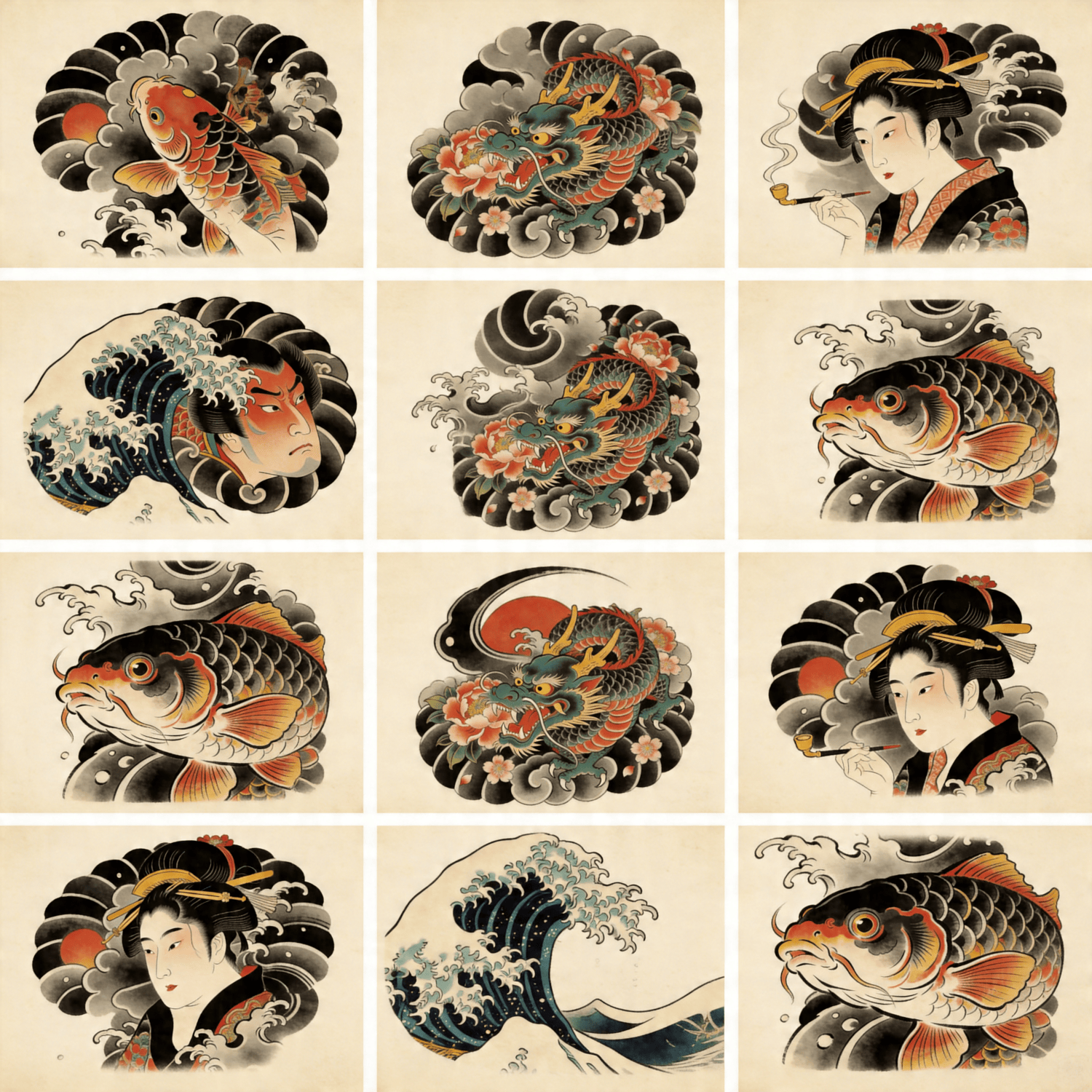 Immerse yourself in the rich heritage of Japanese tattooing. This pack features over 20 traditional Irezumi designs, including koi fish, dragons, cherry blossoms, samurai, geishas, waves, and wind bars. Each design is crafted with bold outlines, deep shading, and vibrant colors, following the principles of classic Japanese body art. Perfect for large-scale projects like back pieces, full sleeves, or chest panels. All files are high-resolution (300 DPI) with transparent background, ready for tattoo artists. Instant digital download.