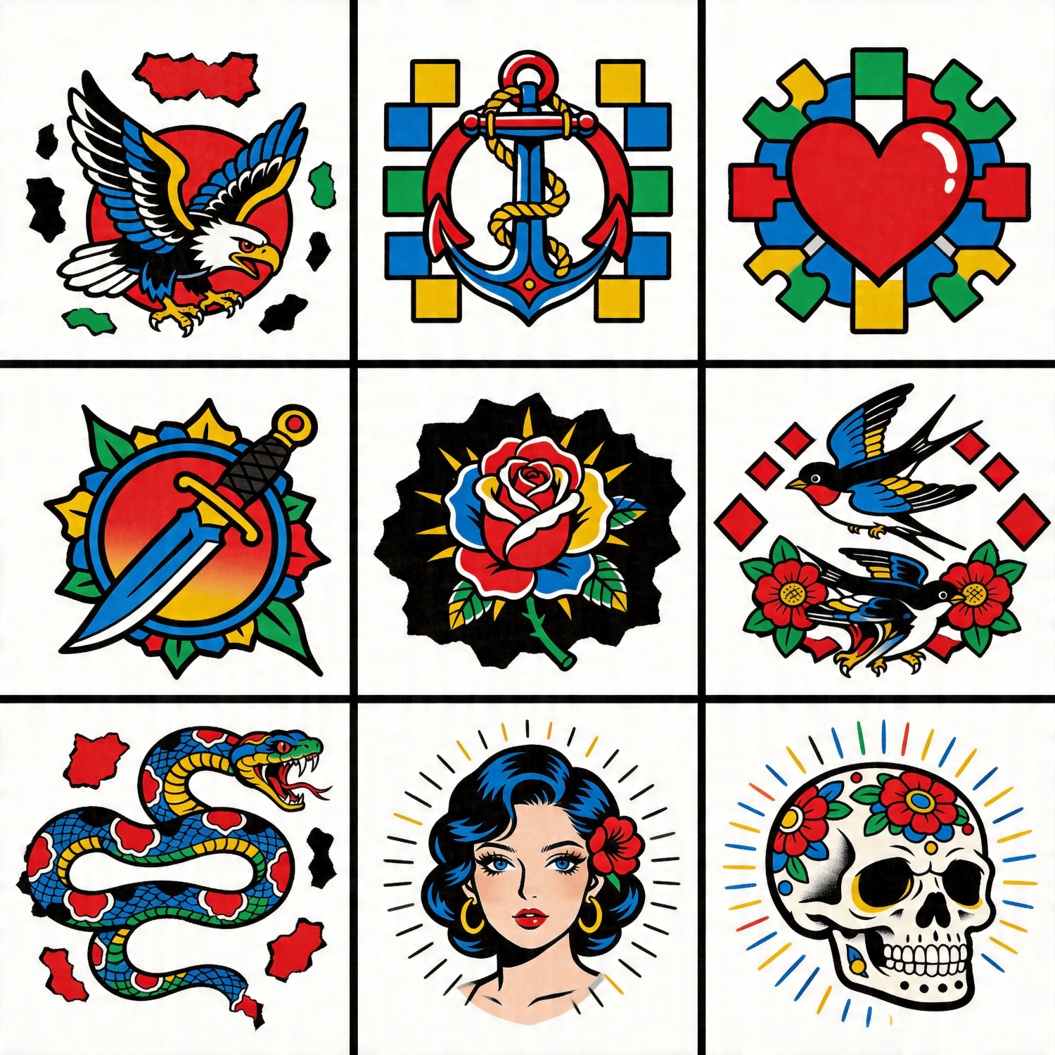 Celebrate the timeless tradition of Old School tattoos. This pack includes over 19 classic designs such as eagles, anchors, hearts, daggers, roses, swallows, and pin-up girls. Each design features bold black outlines, limited yet vibrant colors, and iconic imagery that never goes out of style. Perfect for collectors and first-timers alike who appreciate authentic tattoo culture. All files are high-resolution (300 DPI) with transparent background, ready for tattoo artists. Instant digital download.